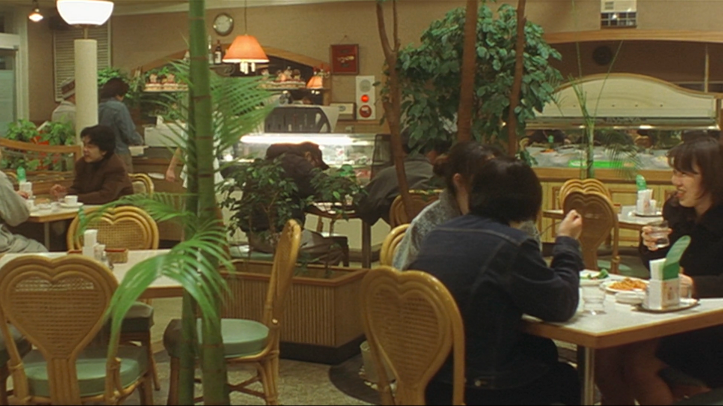 The success of Mamiya’s hypnotism reveals itself in two blink-and-you’ll-miss-them moments at the film’s end. First, we see, for a quick instant, Fumie Takabe dead, an X slashed into her throat. Then, in Cure’s final, astonishing scene, we see Takabe in a cafe. Nothing appears amiss, as we get a wide shot of his server leaving his table and going about her duties at the restaurant. Then we see her, if we’re watching closely, deep in the shot amid the clutter of the dining room, pull out a large knife, the scene ending almost as soon as we get a glimpse. She must be, in the world this film has developed, about to kill. It seems that Mamiya’s finally gotten through to Takabe. Takabe’s induced this server to kill. And he’s killed his wife (or hypnotically induced someone else to kill his wife?).