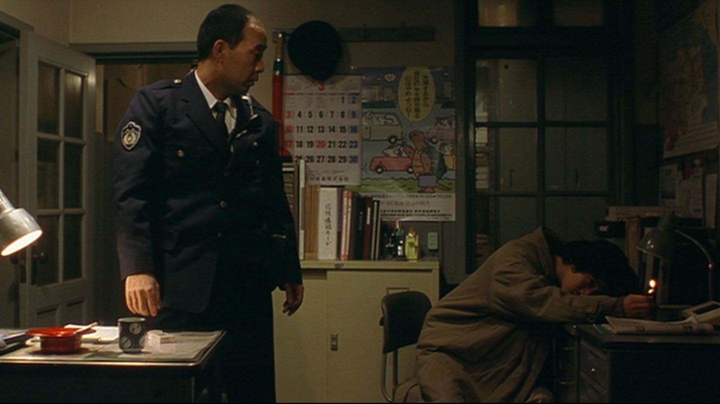 His crimes also challenge our understanding. Mamiya’s hypnotisms are nothing spectacular to behold. A vague conversation culminates in a lighter being struck or a glass of water being spilled or rain dripping from the ceiling, and his victims are suddenly still, entranced by the light or the shimmer. Then Mamiya typically asks a question (e.g. “I’d like to hear about you.”), and, with one exception, the film then cuts away. These are scenes that depict a powerful, almost magical force arising within the mundane, casual flow of ordinary life. Something in Mamiya’s voice, behavior, words, the trick of the light from flame or water—something is giving him power over these people. But it’s never clear what exactly the mechanism really is. This is, of course, the popular perception of hypnotism (and maybe the reality of it?). It’s subtle, something that catches you unaware. Cure establishes a world in which small, seemingly unimportant minutia can reach out and grab hold of you. It’s a world in which our perceptions can’t be trusted, in which a dark, imperceptible mysticism suffuses the mundane.