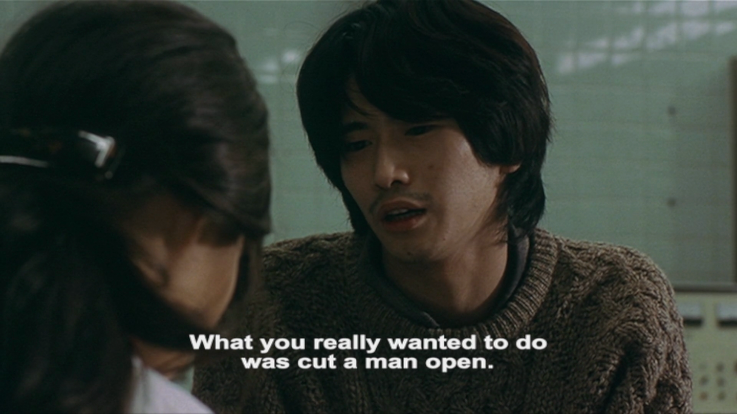 We’re consistently in Takabe’s predicament throughout, unable to trust ourselves. Cure wants us to experience its world as much as witness it. It favors long, bold takes—takes that develop meaning and effect over time, asking us to hold our gaze, waiting for more. We get quick shots of the visual tools of hypnosis: flashing lights and flowing water. We get sudden flashes of a ritually killed monkey, of Takabe’s wife, of a knife being grabbed. And we get whole visions. Takabe finds his wife dead, hanged in their home. Sakuma finds himself outside the building where Mamiya dies, someone staring out at him from the inside. Then we see him in Mamiya’s cell, where we see (again) a ritually killed monkey and then Takabe approaching him menacingly. These are all only revealed as visions after we experience them. Their recurrence destabilizes reality. We can justifiably ask, at any moment, “is this real?” The grammar in Cure—long takes, quick takes, real, unreal—never lets us relax. We find ourselves in an uncertain, untrustworthy world, plagued by what we might be missing, by what we’re failing to grasp.
