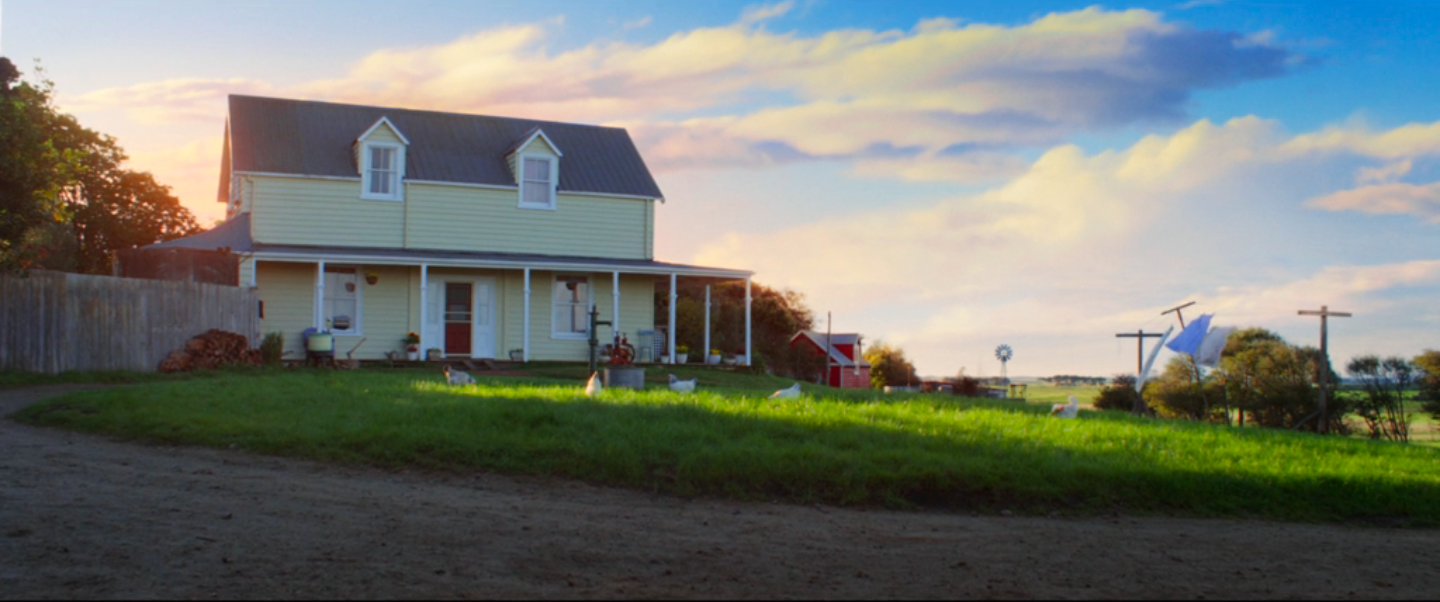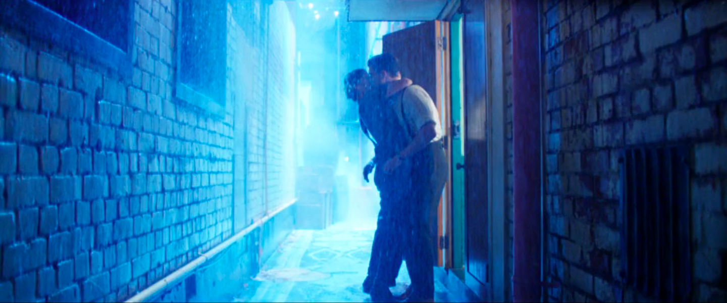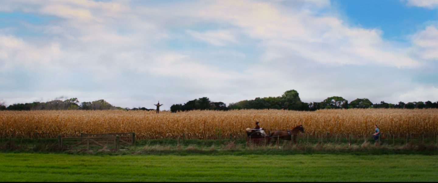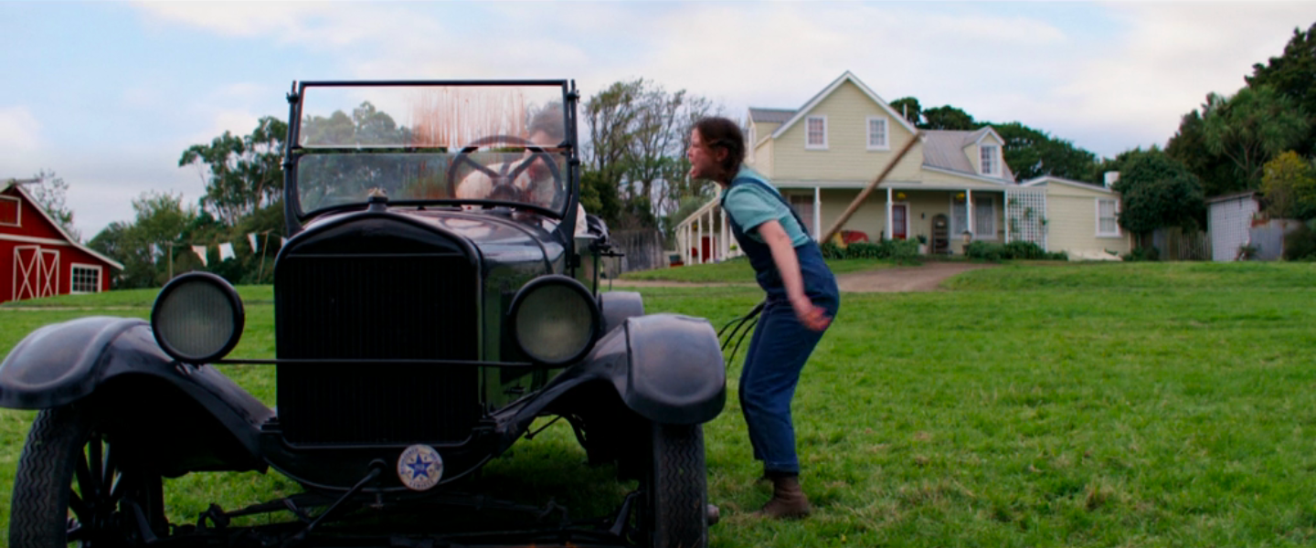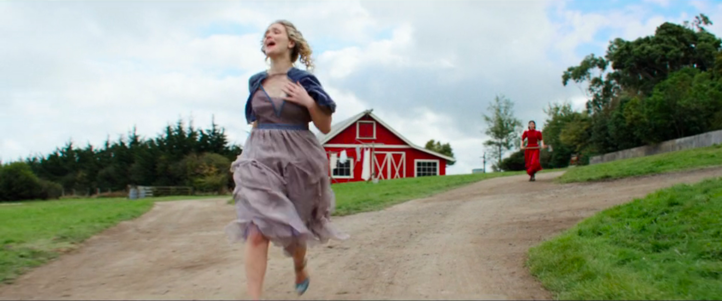 The effect is not to recreate the old Hollywood experience but to conjure it where it doesn’t belong. In the middle of the film, Pearl gives in to simmering romantic tension, rushes to the town film theater to find the projectionist, and they kiss, music swelling, an iris out as he pulls her into the theater. Pure romance. What’s dissonant, though, is what this romantic height comes immediately after: Pearl has set her mother on fire, doused her with boiling water, and moved her to the basement. After that comes the romance. In another memorable visual, the sunlit farm—green grass, blue sky, bright red barn—is the stage for a scene where the action description could come straight out of a 70s slasher: Pearl chasing down her sister-in-law with an axe. It’s slasher mayhem in romantic old Hollywood.
